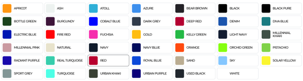 weiß, gelb, orange, rot, pink, lila, hellblau, dunkelblau, türkis, petrol, apfelgrün, dunkelgrün, taubengrau, schwarz, Glitzer- und andere Folien auf Anfrage!